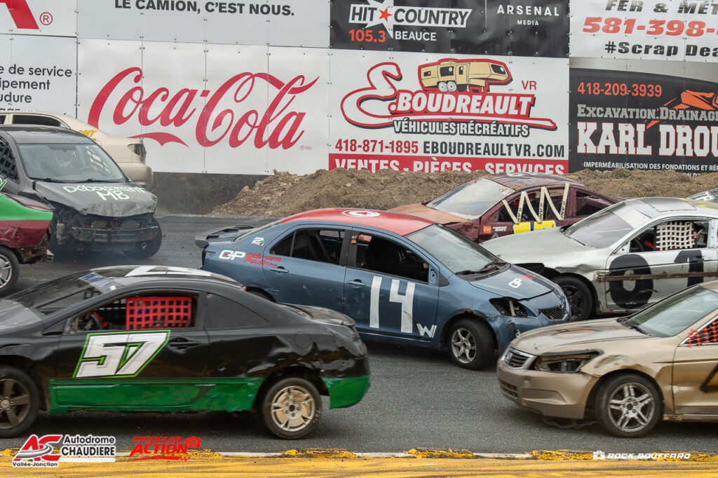 Au 125e tour, le top 5 est composé du no.18, suivi d’Alex Bisson no.98 de Mirabel, d’Éric Morrissette no.07x de Québec, de Claude Goupil no.71 de Québec et du no.03 de Stéphane Langevin de Terrebonne. À la mi-course une quarantaine de voitures sont toujours en piste et le tempo s’accélère sur cette dernière.
